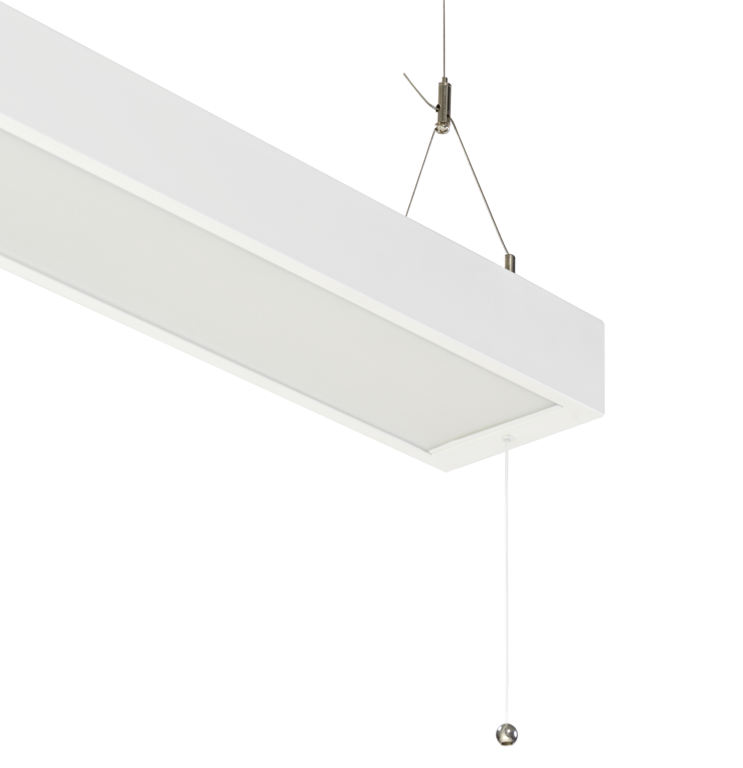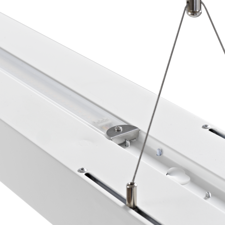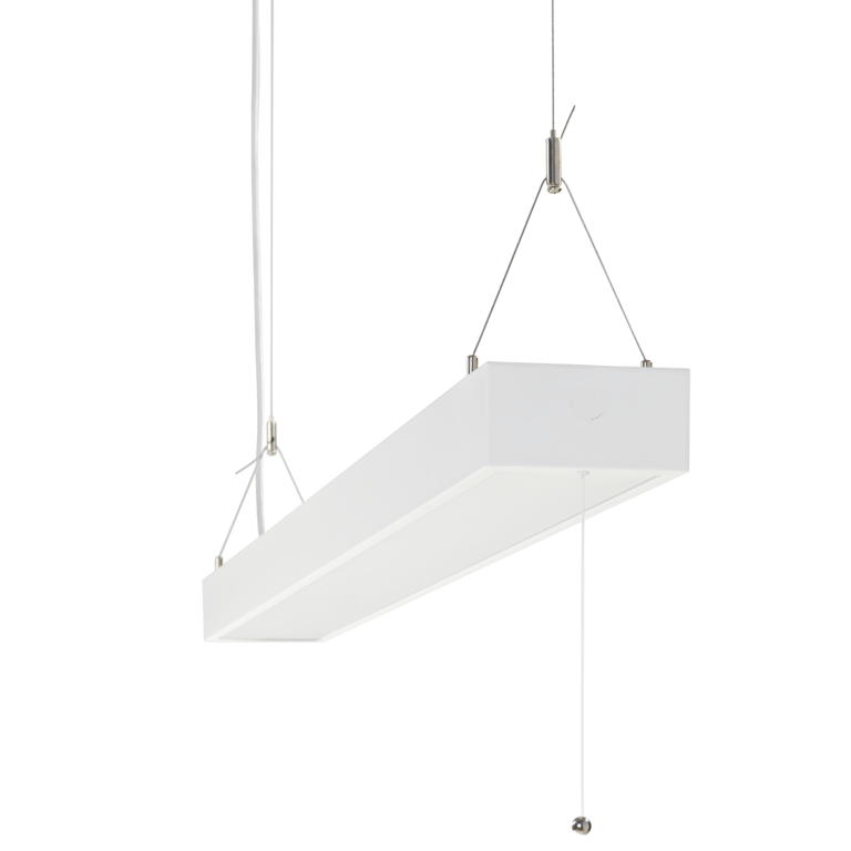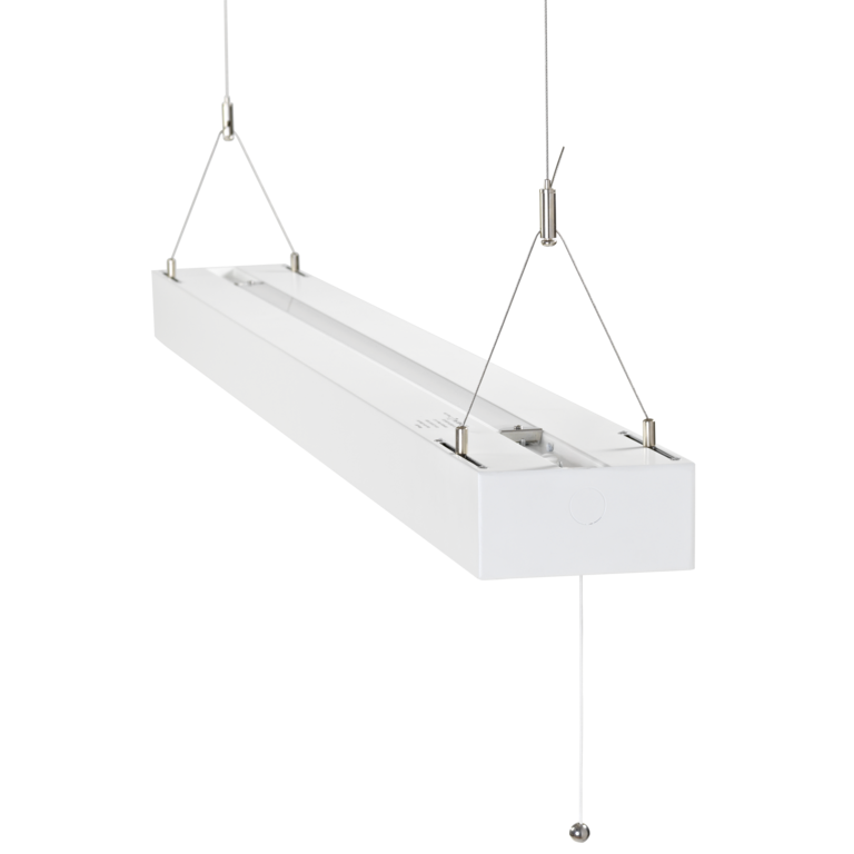 Armaturen gir opptil 3600 lumen nedover og 2000 lumen oppover, med lav blendingsverdi (UGR 19) og høy effektivitet.