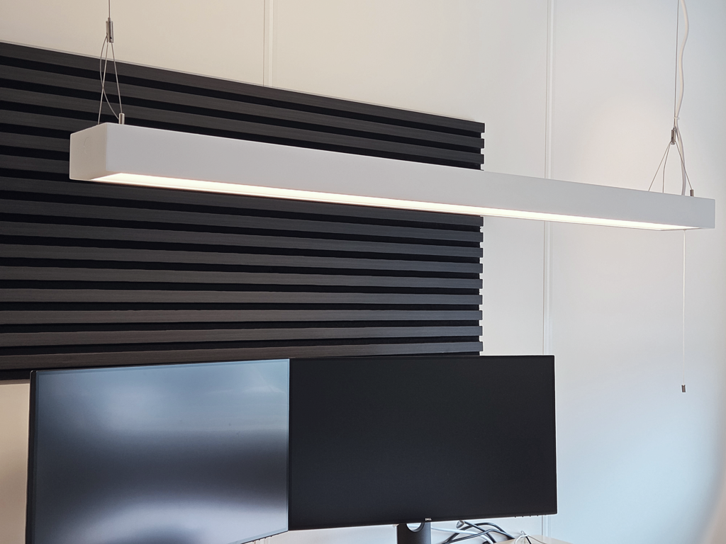 Moderne nedhengt armatur med opp/ned-lys, tilpasset kontormiljøer med høye krav til visuell komfort.