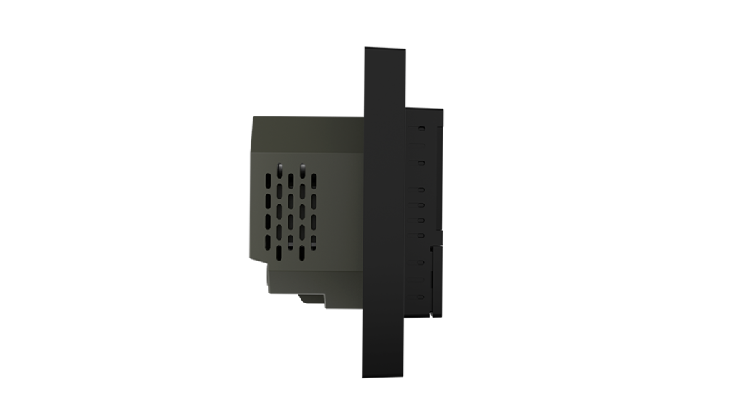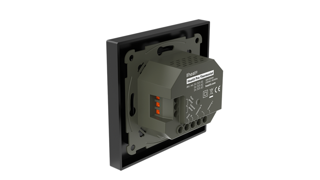 Monteres i standard veggboks og passer inn i System 55 rammer. Termostaten har metallramme for solid innfesting i veggboks. Den har en intern temperaturføler, men kan også tilkobles to eksterne temperaturfølere.